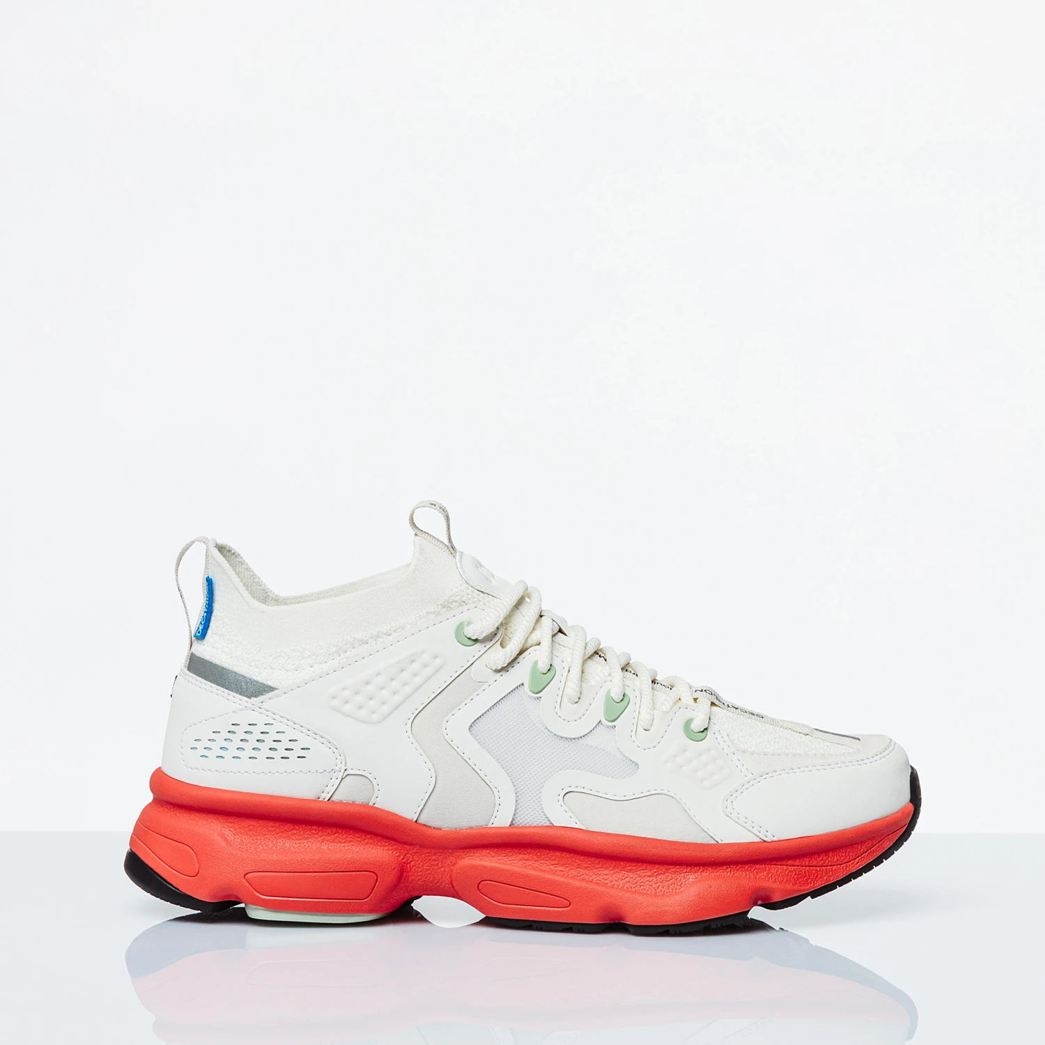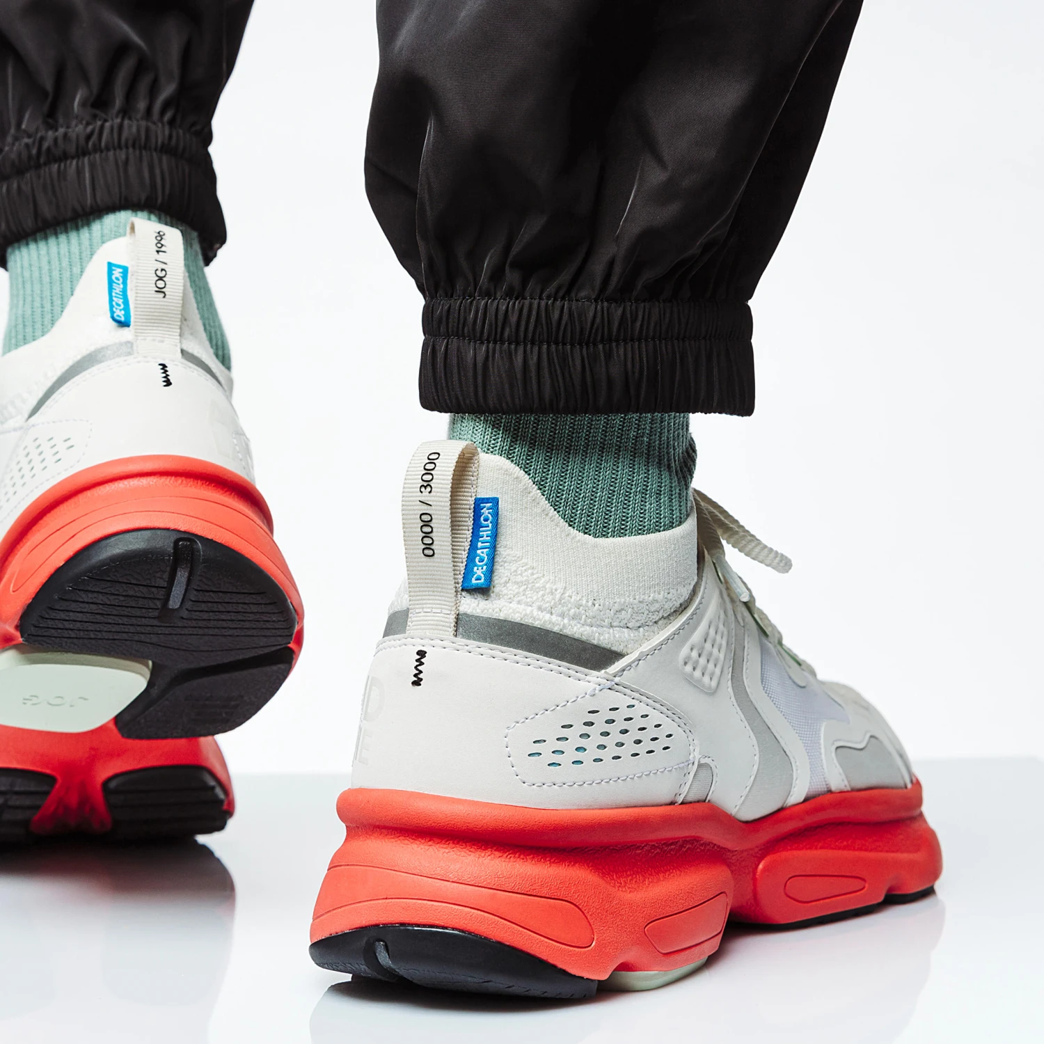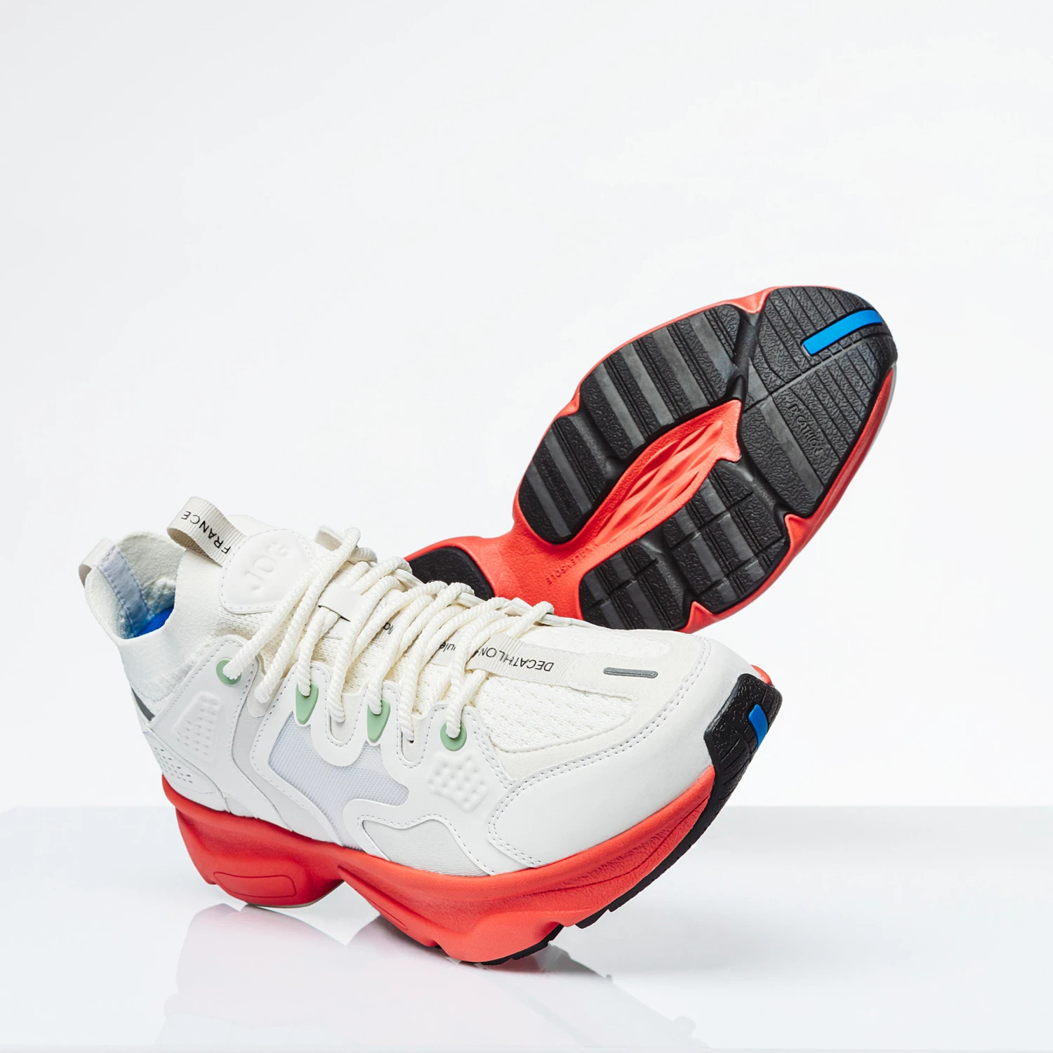 a sole inspired by the flex with exaggerated lines and a more dense thickness, a tongue replaced by a knit sockliner for style and comfort, a Decathlon label that talks about our identity and history, a significant text detailing are expertise: our address, where our products are designed each day